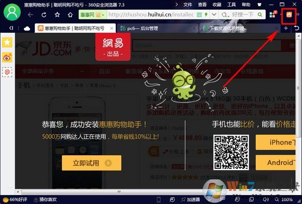 安装后360浏览器会重新启动,然后在浏览器的右上角可以看到“惠惠购物助手”插件