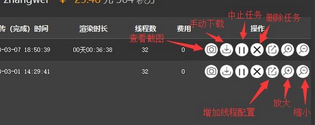 4、提交成功后 ,客户端会出现任务列表。每行任务有如下几个按钮,另外每行任务有几个右键功能,大家可以根据需要使用。见图解: