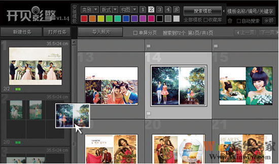 开贝影擎搭载强大的模板搜索引擎,用户可以根据照片类型、输出尺寸、照片分组张数、颜色风格等属性搜索合适的模板,支持模板拖入照片分组、批量自动匹配模板功能。