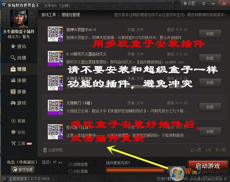 第二步,多玩盒子安装,安装完毕之后,点击插件更新,见下图(建议多玩盒子少装或者不装插件)