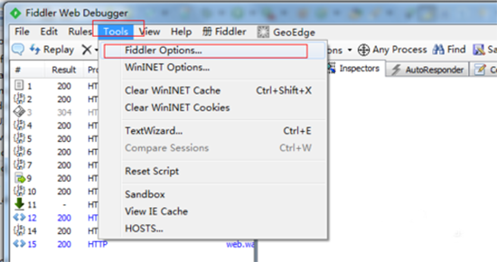 1.启动Fiddler,打开菜单栏中的 Tools > Fiddler Options,打开“Fiddler Options”对话框。