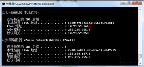 3.在本机命令行输入:ipconfig,找到本机的ip地址。