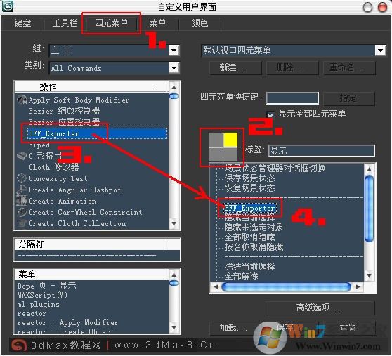 4. 弹出界面设置,选择“四元菜单”,按图设置,把“BFF_Exporter”拖入到右键快捷列表内,见下图!