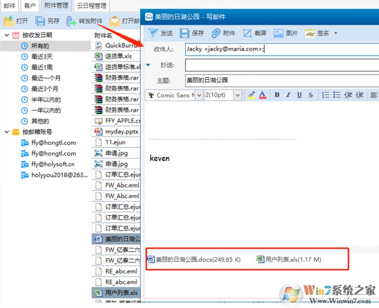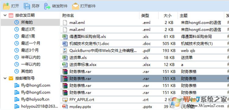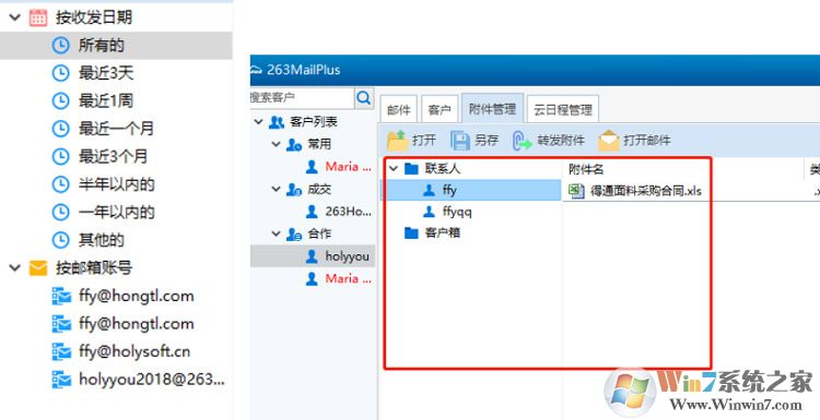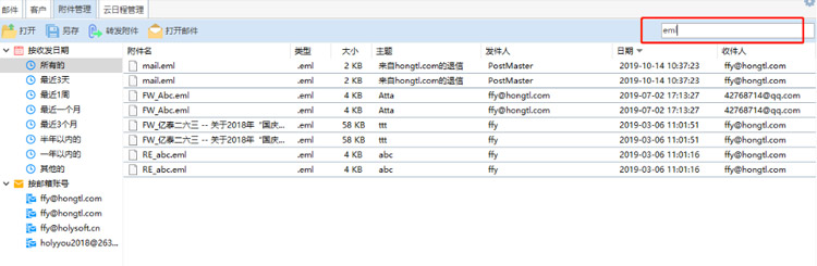 附件分类, 按收发日期,按邮箱帐号,选择客户后出现按客户的附件分类,如图