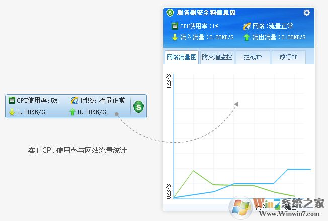 悬浮式信息窗口显示CPU使用率、网络状态、实时流量统计、网络流量图、防火墙监控数据、拦截放行IP记录等重要数据,便于您随时了解服务器运行情况,掌握服务器最新动态。