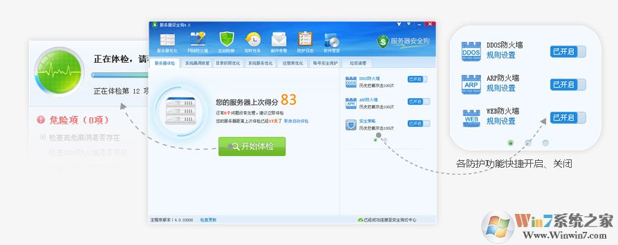 服务器体检、系统漏洞修复、系统帐号优化、目录权限优化、系统服务优化、注册表优化、垃圾清理,服务器安全狗提供最全面,最便捷的的服务器系统优化。