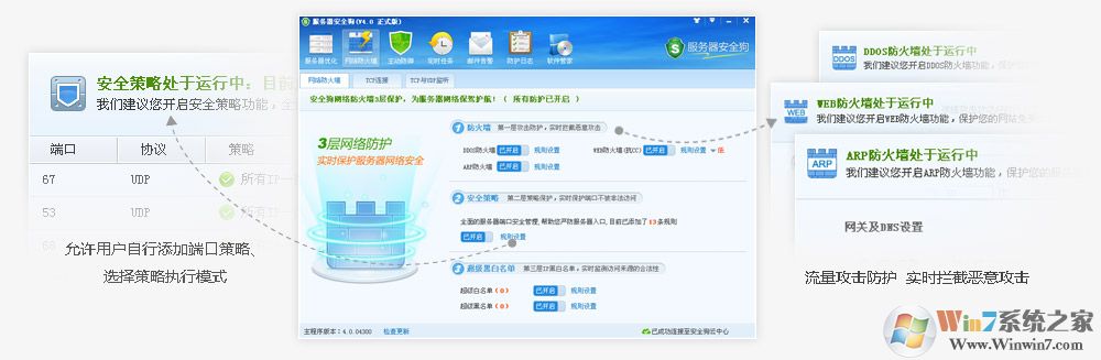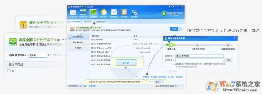 文件目录守护,从文件驱动层保护服务器文件不被非法修改;帐号保护,帐号权限设置保护服务器安全,防止黑客提权;远程桌面保护,有效防止黑客登录服务器远程桌面。
