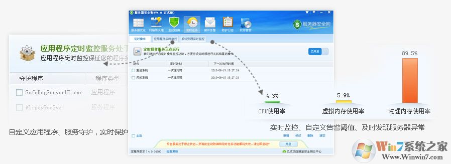 定时操作方便服务器关机重启;应用程序实时监控保证应用程序及服务异常关闭时自动启用,保障应用程序及服务持续运行;系统资源实时监控,服务器系统资源实时监控,及时了解服务器异常。