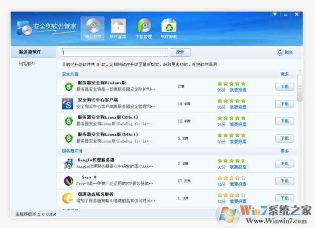 安全狗软件管家,服务器软件管理的首选工具。集服务器常用软件的下载、更新、卸载功能为一体,提供近1000款服务器必备软件,为服务器管理者提供最便捷、可靠的软件管理保障。