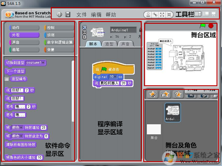 在S4A中,Arduino板由一种特殊的精灵来表示。Arduino sprite会自动找到连接板的usb端口。