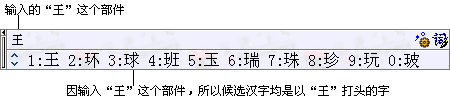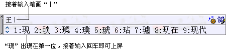 | 部件选取的顺序以汉字笔顺为准,即按笔画输入到有部件时就进行部件的输入。 如:"现"字,"王"为一部件,首笔为"一",输入6,"王"便出现在输入框中,序号为1(图一),所以输入1(也可以直接用鼠标点击),这就完成"王"部件的输入(图二);然后再输入下一笔"丨",代码2,"现"便出现在候选汉字第一位(图三),按回车或空格完成输入。"现"的代码为612。 |