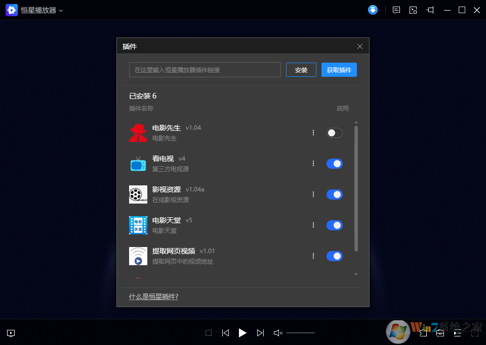 另外除了播放本地+网络视频外,恒星播放器还可以通过安装「插件」来扩展软件的功能,这点和 Chrome 浏览器非常类似,点击右下角的「插件管理」,即可查看所有的插件+在线搜索安装插件。