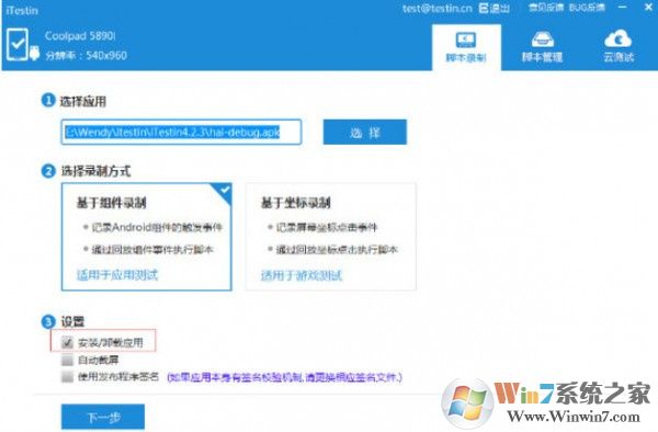 只需选择一个App应用程序包,iTestin自动解析App并安装完成,自动提示操作者在设备上直接操作应用程序,在需要观察测试结果的地方截图,操作完成后保存数据即形成了一个测试脚本。