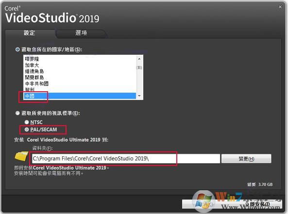 4、选择中国,我们再设置标准为pal/secam,默认安装目录【C:\Program Files\Corel\Corel VideoStudio 2019\】建议不要更改安装目录。