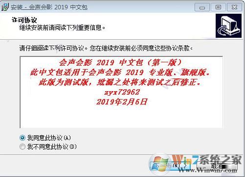 7、安装好原版之后,双击“会声会影 2019 中文汉化包.exe”进行汉化破解,同意条款点击下一步;