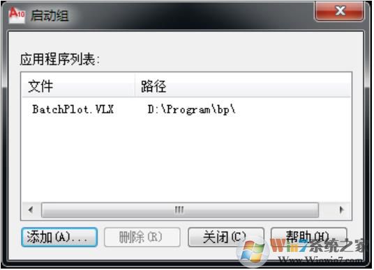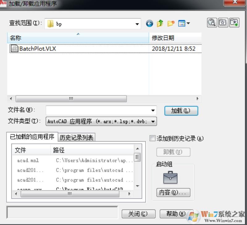 1、打开 AutoCAD,在命令行输入命令“ap” 回车,打开“加载/卸载应用程序”对话框,点击右下角启动组内“内容”按钮,弹出启动组对话框,点击左下角“添加”按钮,选择 BatchPlot.VLX 将其添加到启动组的应用程序列表中。关闭对话框后重启CAD即可。