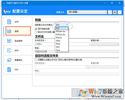 三、在“保存”中设置我们要将文档转换的格式如PDF(图中红框以及红圈所示),选择完成之后点击右下角保存按钮。