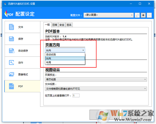 四、如果要对转换的PDF格式文档进行更深的设置则可以点击左边最下面的“PDF”,进入设置页面后可以看到很多设置选项,如页面方向可设置为纵向或者自动侦测布局等。