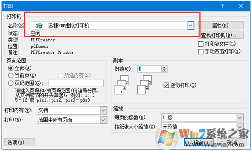 五、保存好设置后,启动Office,选择任意格式的文档,打开打印功能,在打印机选项的那一栏下拉,选择“迅捷PDF虚拟打印机”(红框所示),之后点击右下角确定。