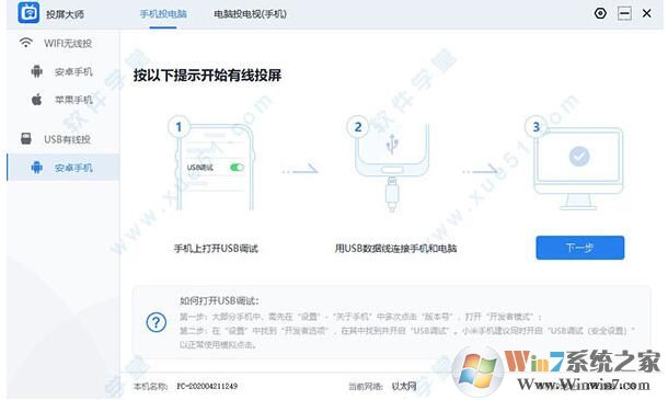 4、手机上打开usb调试,然后用usb数据线连接手机和电脑再点击下一步即可投屏。