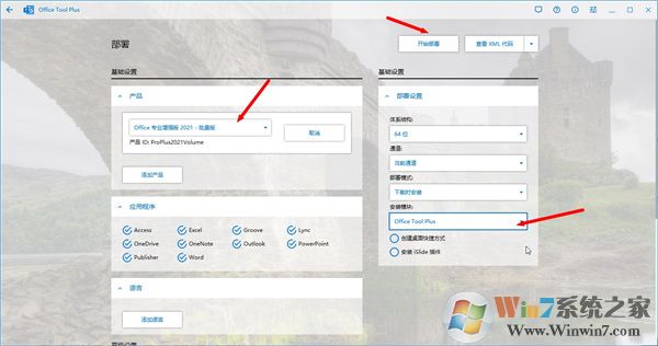 5、在安装office之前一定要卸载之前的旧版本,在产品选项中选择office专业增强版2021,选择64位,还需要选择office tool plus安装模块,点击右上角的开始部署;