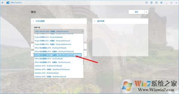 9、在OfficeToolPlus主界面中,点击激活,此时选择office专业增强版2021批量版;
