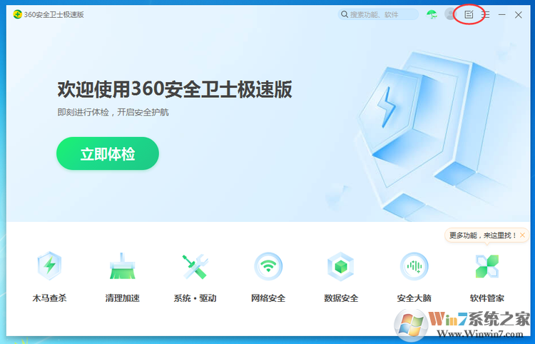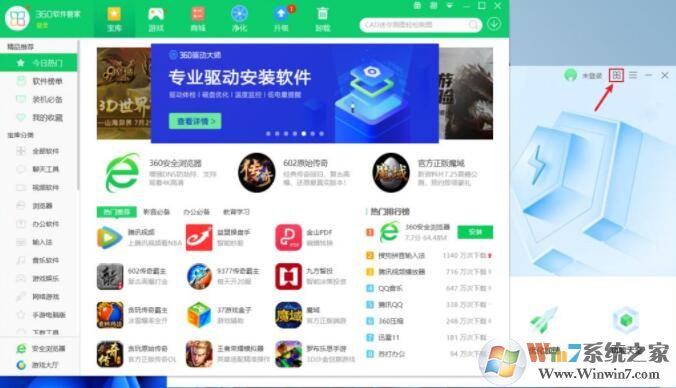 5、不过,点击 360 安全卫士极速版右上角的按钮(已红框标记),会打开 360 软件管家,在这个界面会出现几秒钟的软件内弹窗,但也只出现了一次,可能没有净化完全。
