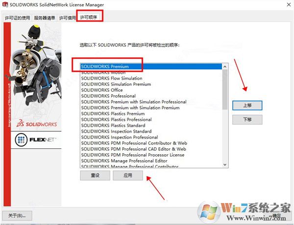 12、运行SolidWorks,依次打开帮助> SolidNetWork License Manager >许可顺序,将Premium产品移动到Professional和Standard之上,点击应用并确定,重新启动SolidWorks;