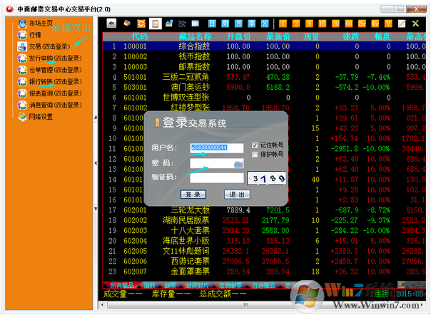 1、电脑客户端登陆界面。(首次登陆请按照提示修改初始密码,以后鼠标双击交易,输入用户名(n580808„„)和更改的密码就可以登陆)