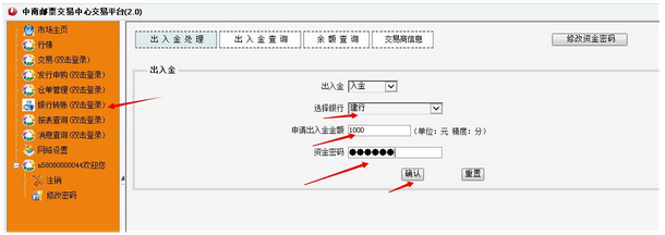 3、银行转账界面(鼠标双击银行转账,选择开户绑定的银行:建行、工行或招行,输入要转入的金额和您设置的资金密码,点击确认。从银行转入中南交易中心账户,选择入金;从中南交易中心账户转出到银行,选择出金)