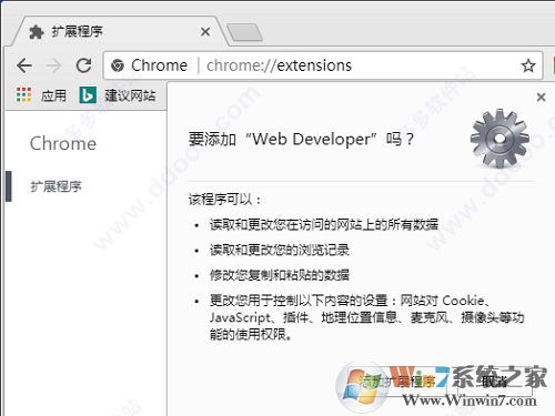 1、首先在标签页输入【chrome://extensions/】进入chrome扩展程序,解压你在本页下载的Web Developer插件,并拖入扩展程序页即可。