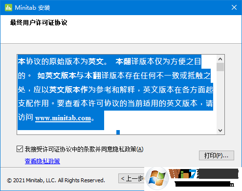4、勾选“我接受许可证协议中的条款并同意隐私政策(A)”后,点击“下一步”