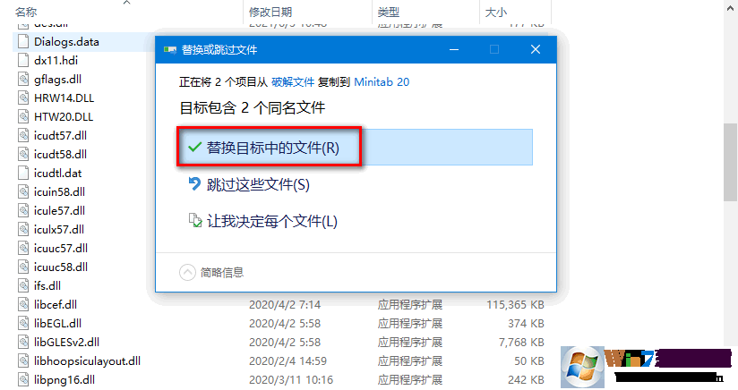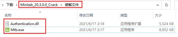 10、到解压出的文件夹“Minitab_20.3.0.0_Crack”中找到“破解文件”中的“Authentication.dll”和“Mtb.exe”,将其复制到minitab20的安装目录下,并替换。