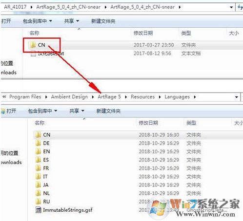 安装完成之后,ArtRage_5_0_4_zh_CN-snear目录下的CN文件夹复制到软件安装目录的Languages文件夹中,即可完成汉化,如图: