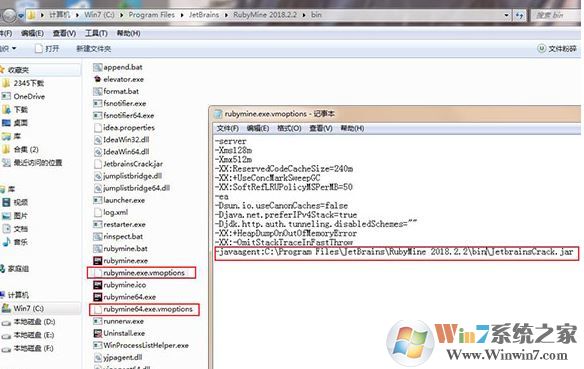 2、在bin目录下记事本打开rubymine.exe.vmoptions和rubymine64.exe.vmoptions两个文件并在文件中添加-javaagent:C:\Program Files\JetBrains\RubyMine 2018.2.2\bin\JetbrainsCrack.jar然后保存
