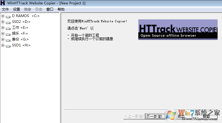 1、打开WinHTTrackWebsiteCopier,下一步