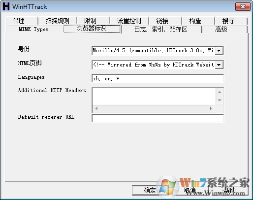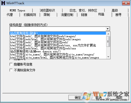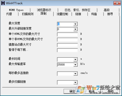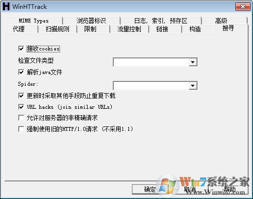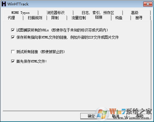 5、链接我选择了试图捕获所有的URLs,保存所有指向非HTML文件的链接,例如外部的zip文件或图片文件,首先保存HTML文件,取默认也行,没看出多少区别。