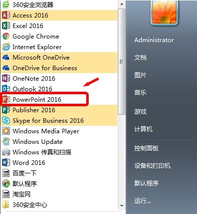 5、重启之后,程序可能不会出现在桌面上,这个时候在电脑上点击“开始”点击“所有程序”,找到“Powerpoint 2016”打开软件;