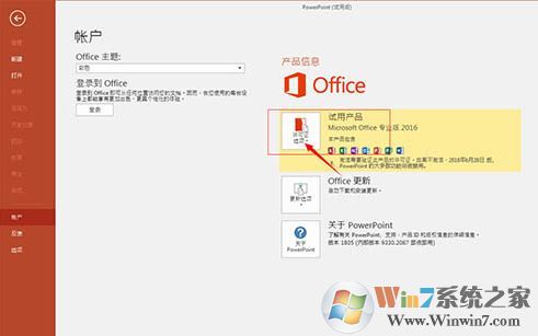 6、重新打开就会弹出Powerpoint 2016打开界面,之后点击文件,并点击“试用产品”;