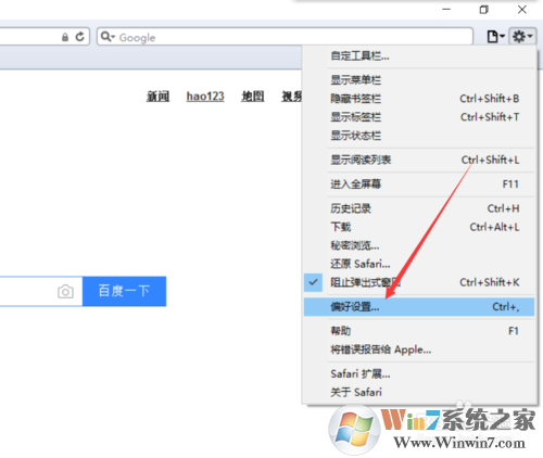 2、在Safari设置弹出的子菜单里直接点击【偏好设置】,如下图所示。