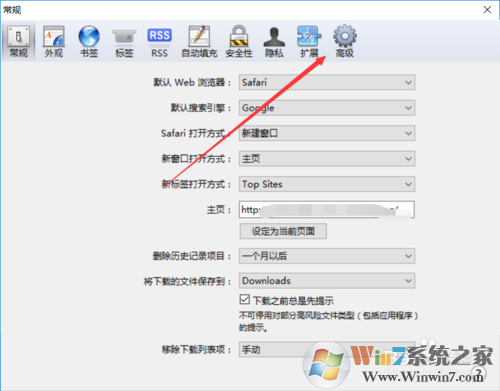 3、在打开的Safari偏好设置对话框后直接点击上面导航的【高级】选项,如下图所示。