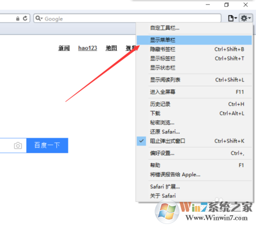 5、设置好显示开发菜单后,再次点击Safari浏览器右上角的设置图标,然后再点击【显示菜单栏】,如下图所示。