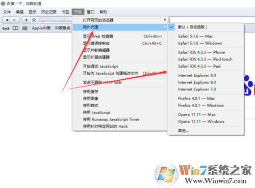 将鼠标移动到Safari开发选项子菜单里的【用户代理】选项上,此时会在展开三级菜单,这里就是Safari浏览器的所有兼容模式了,如下图所示。