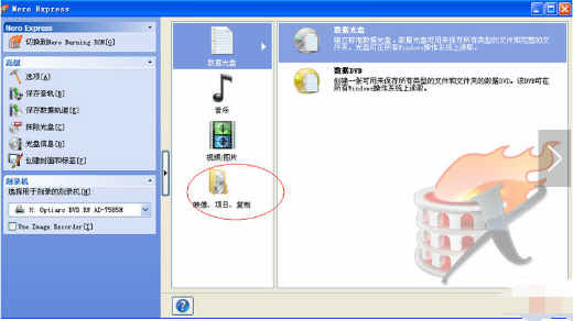 2、选择“刻录数据光盘”,点击“映像,项目,复制”一栏,在右侧,选中“光盘映像或保存的项目”,弹出添加映像文件的窗口