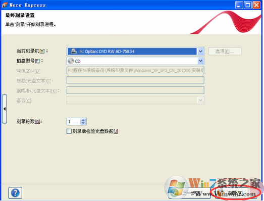 4、设置完成后,单击“刻录”,出现刻录界面,如若此时没有装入CD或DVD空盘,将出现下面的提示