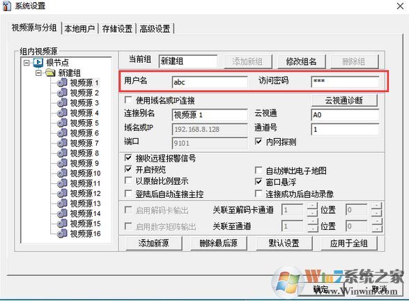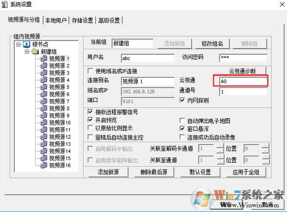 随后根据前端开发设备的类型选择视频源数量,然后点击应用于全组,该云视通手机号码就应用到整个视频源了。