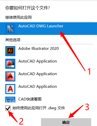然后选择AutoCAD DWG Launcher这个,选择始终使用此应用打开,然后点击确定。
