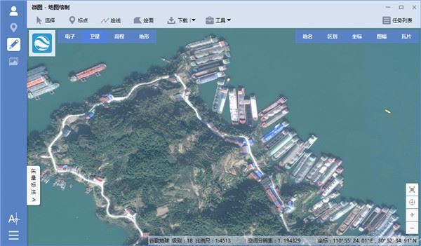 3.导出无限大图(可分块导出)。导出瓷砖(可重投影)。导出地图离线包。矢量点标记。矢量路径绘制。矢量面轮廓绘制。