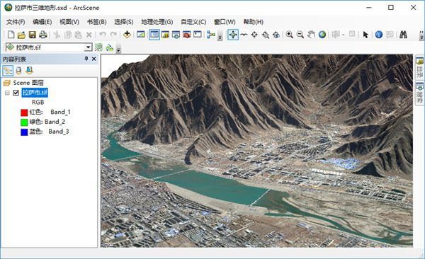 下载卫星影像和高程数据之后,可以在ArcScene中构建离线三维场景,效果如下图所示