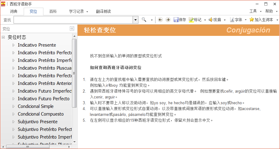 西班牙语助手内置了19种西班牙语时态动词变位方法,支持1万多个常用动词的查询和反查,极大地方便了西班牙语初学者。同时,整理不同时态的变位规则,帮助用户尽快掌握西班牙语动词变位。
